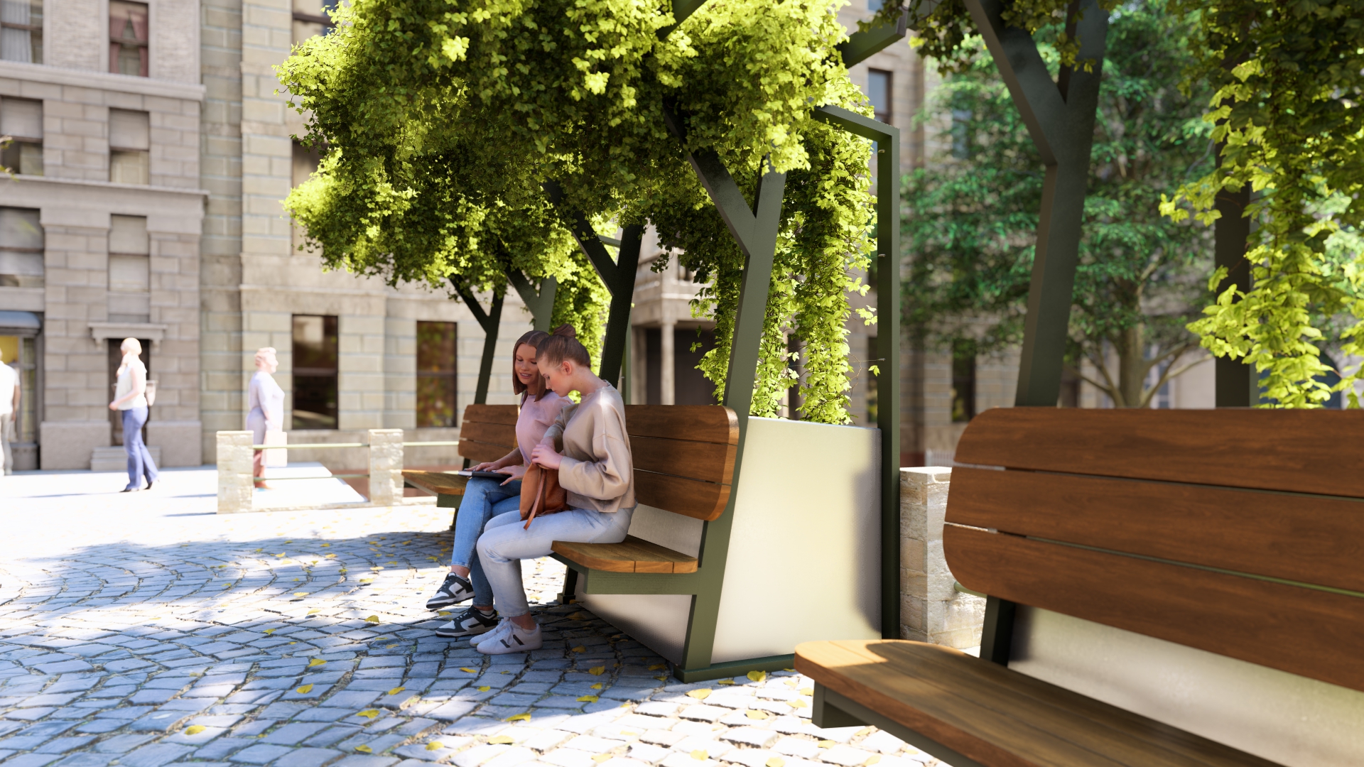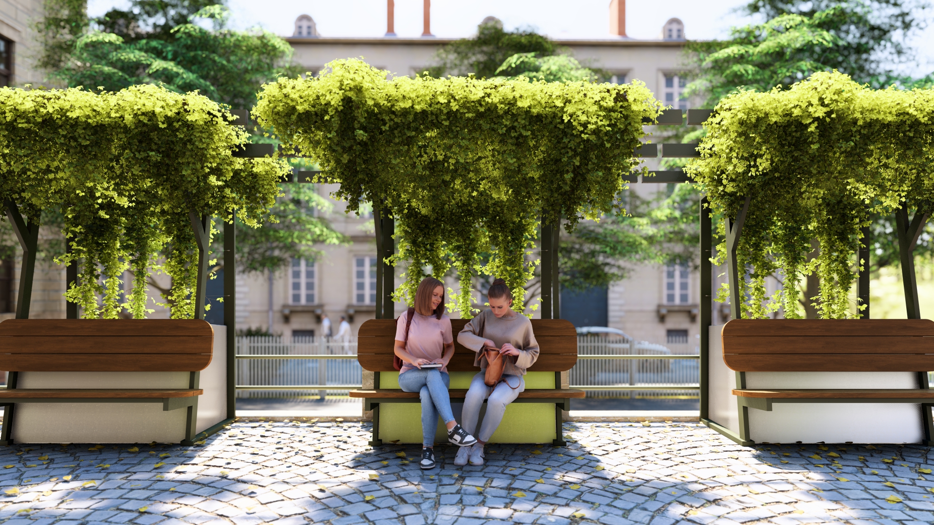 Inspirée des pergolas méditerranéennes, l’assise Fotos se présente comme un véritable îlot de verdure au cœur de l’espace public.