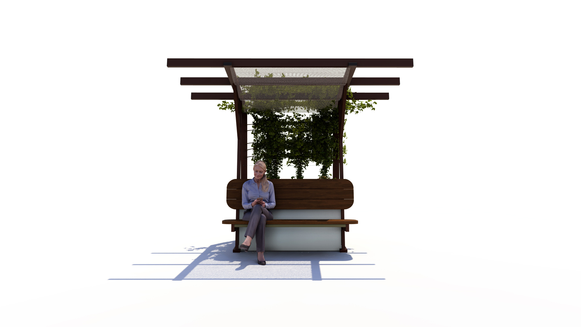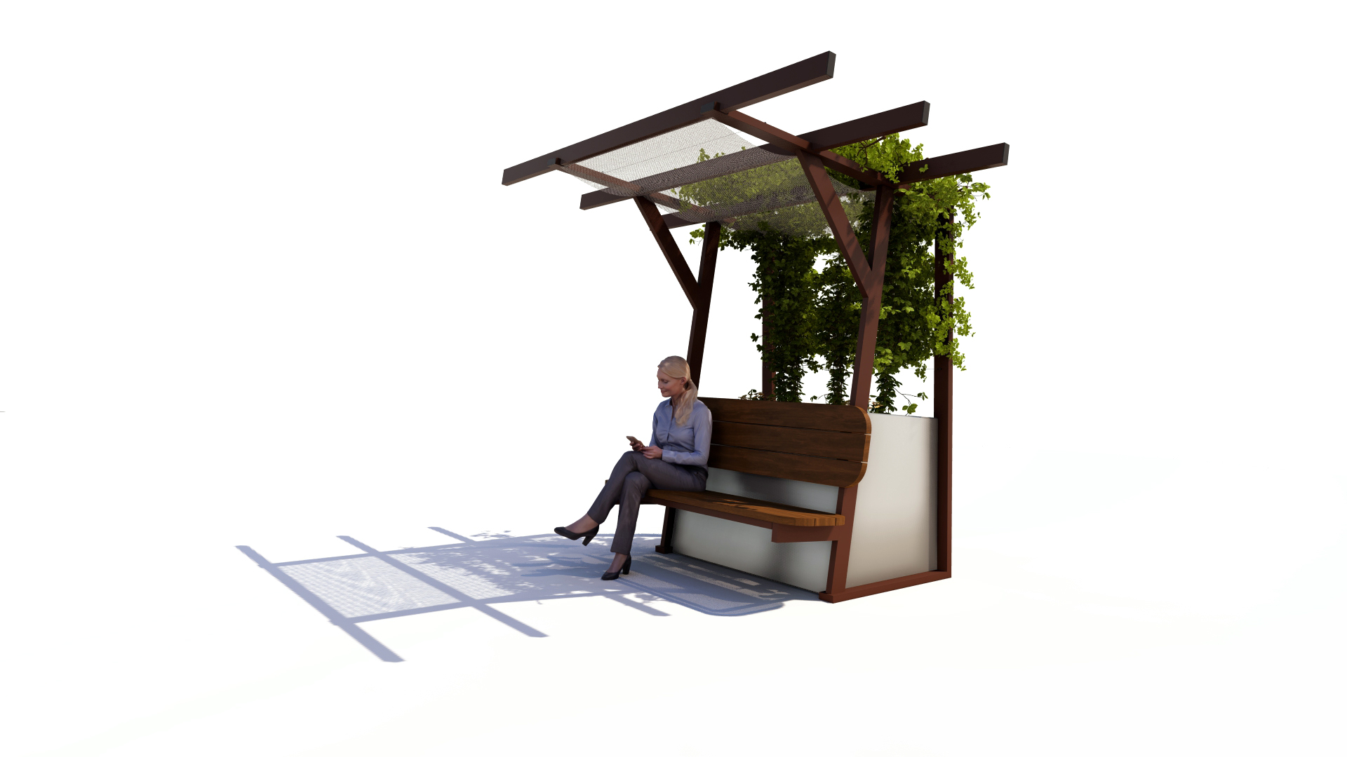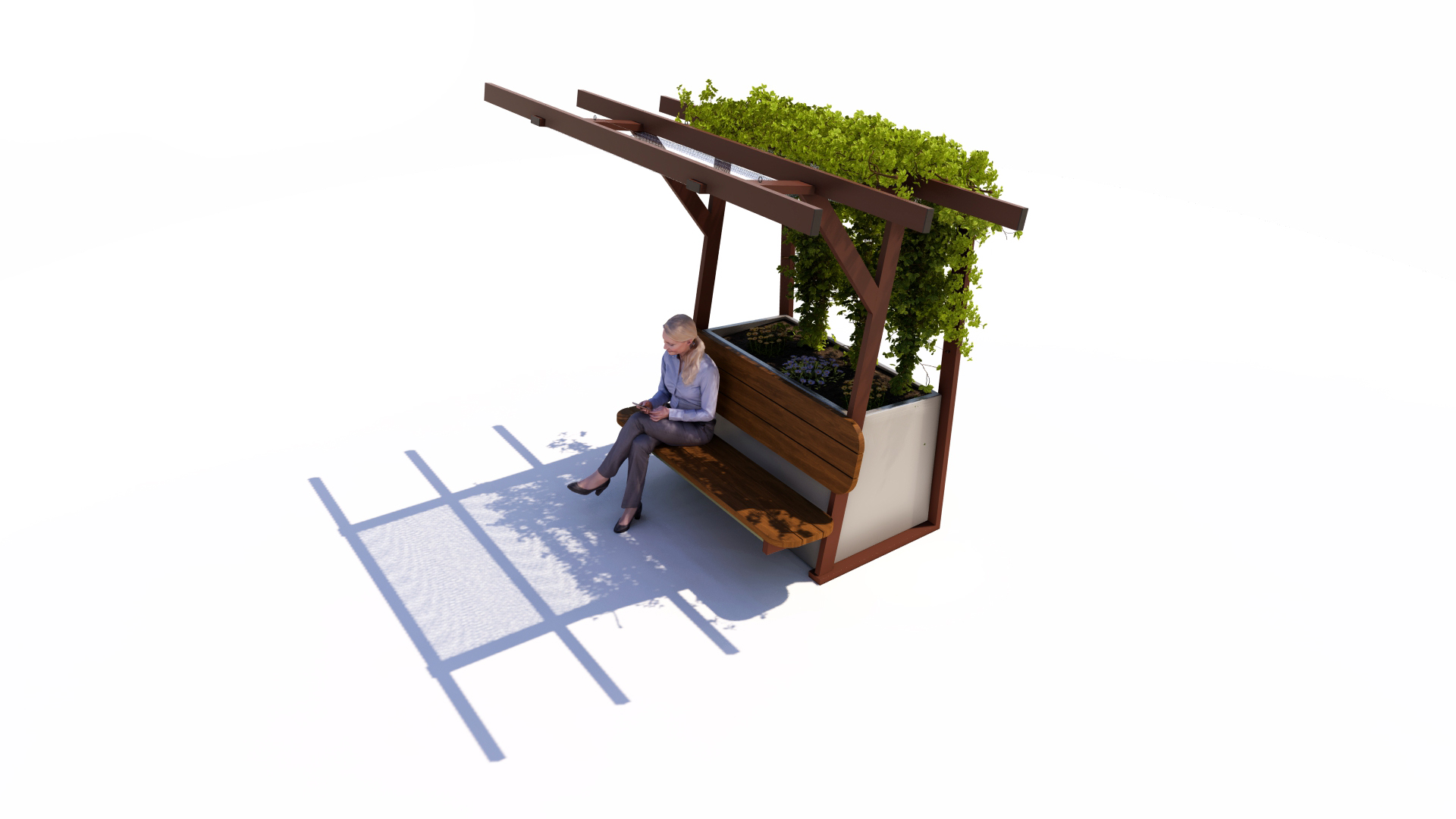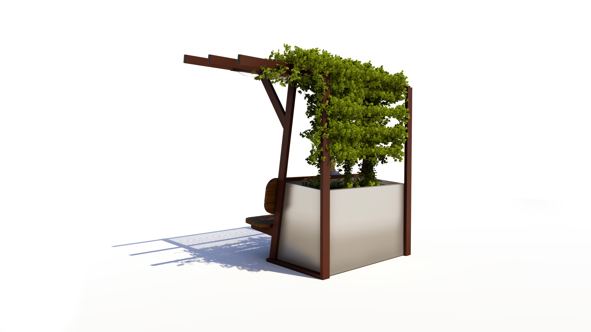 Pensée pour accueillir une pause, un échange ou un moment de détente, elle invite naturellement à s’installer dans un cadre apaisé. L’assise et le dossier, composés de larges lames en bois de Kebony, offrent un confort chaleureux et durable. La structure en aluminium, à la fois robuste et légère, intègre une jardinière pouvant être thermolaquée selon les contraintes du projet. Au-dessus, une charpente ajourée accompagne le développement des plantes grimpantes, créant un ombrage naturel qui évolue au fil des saisons.