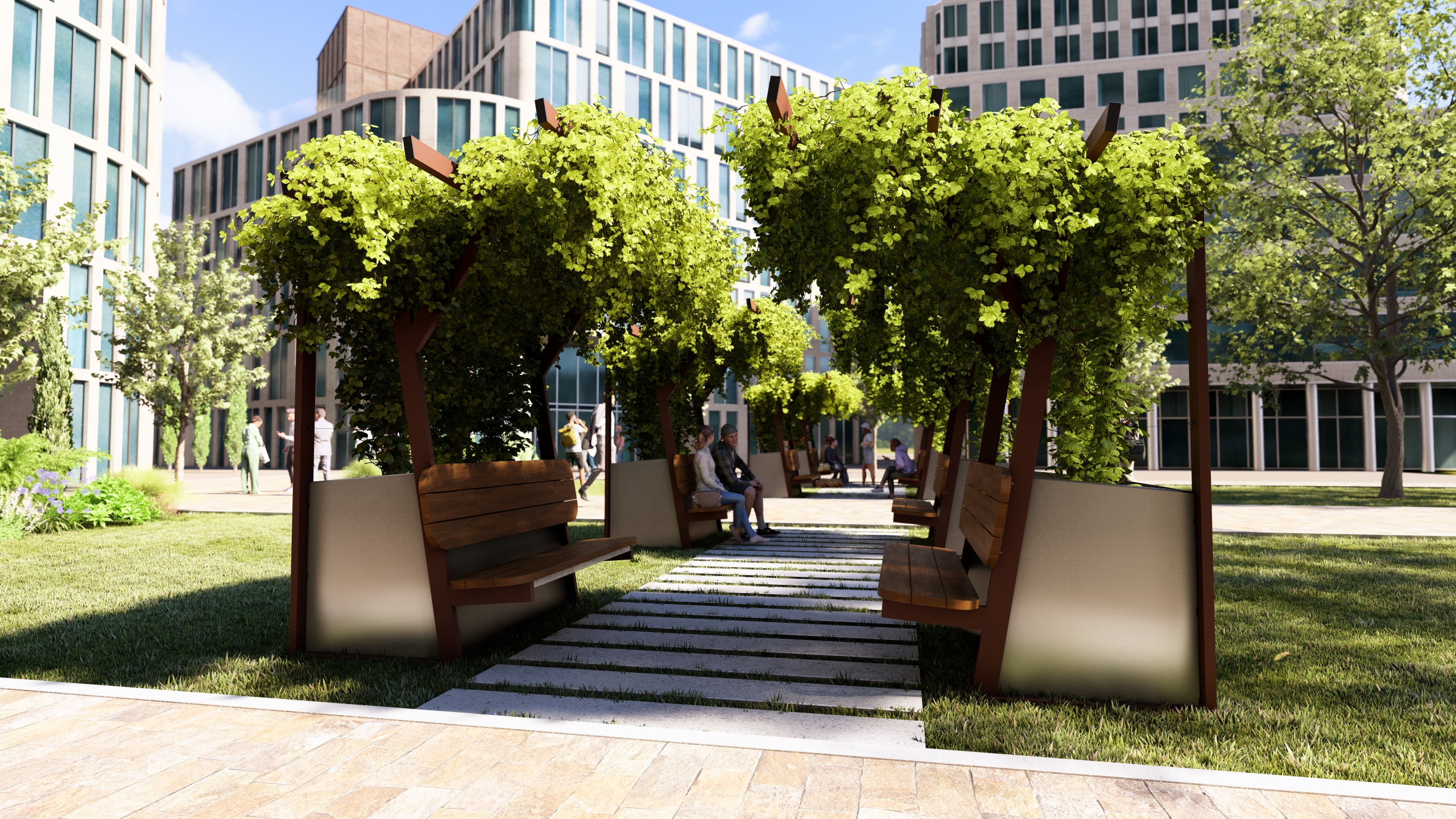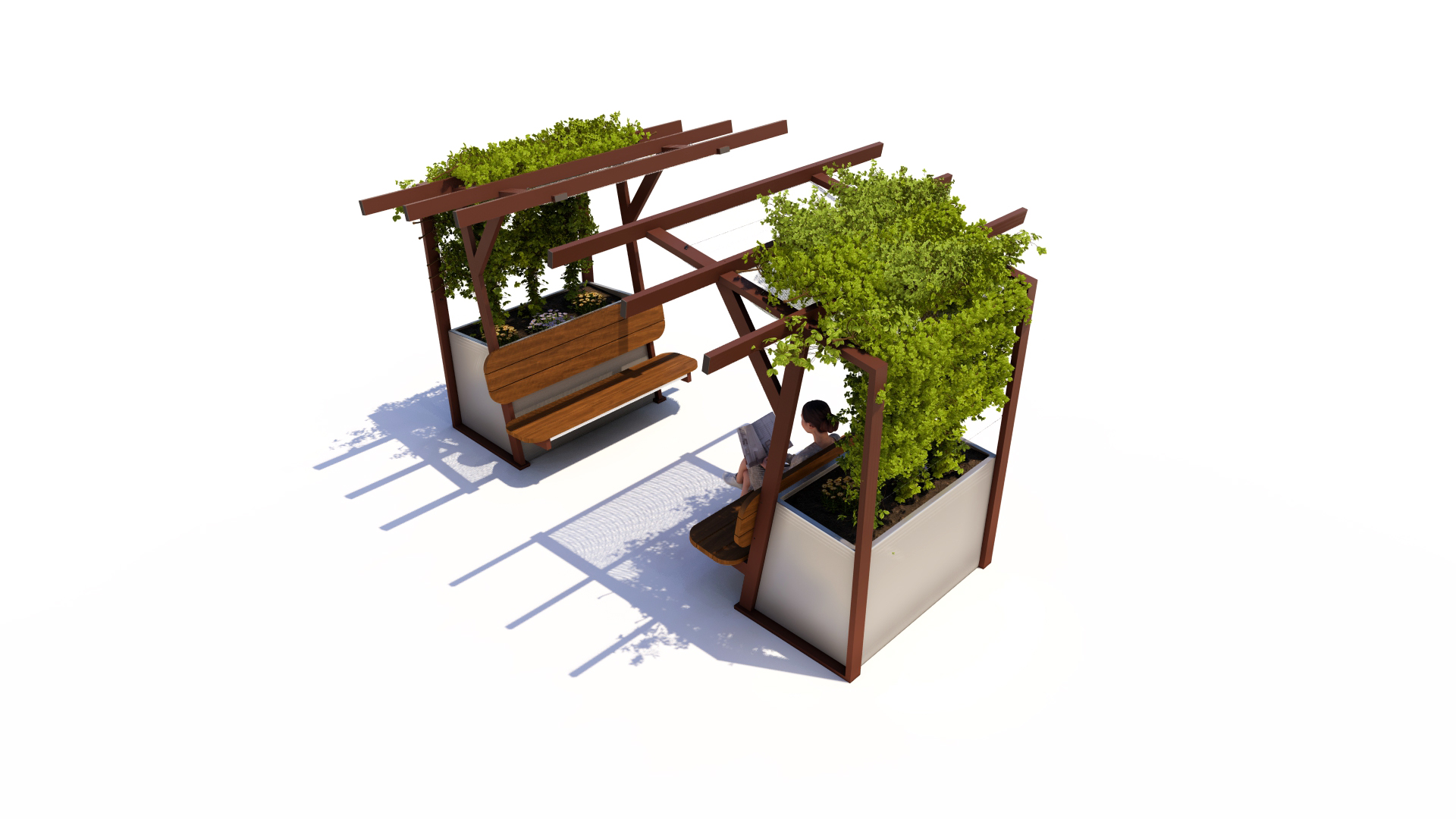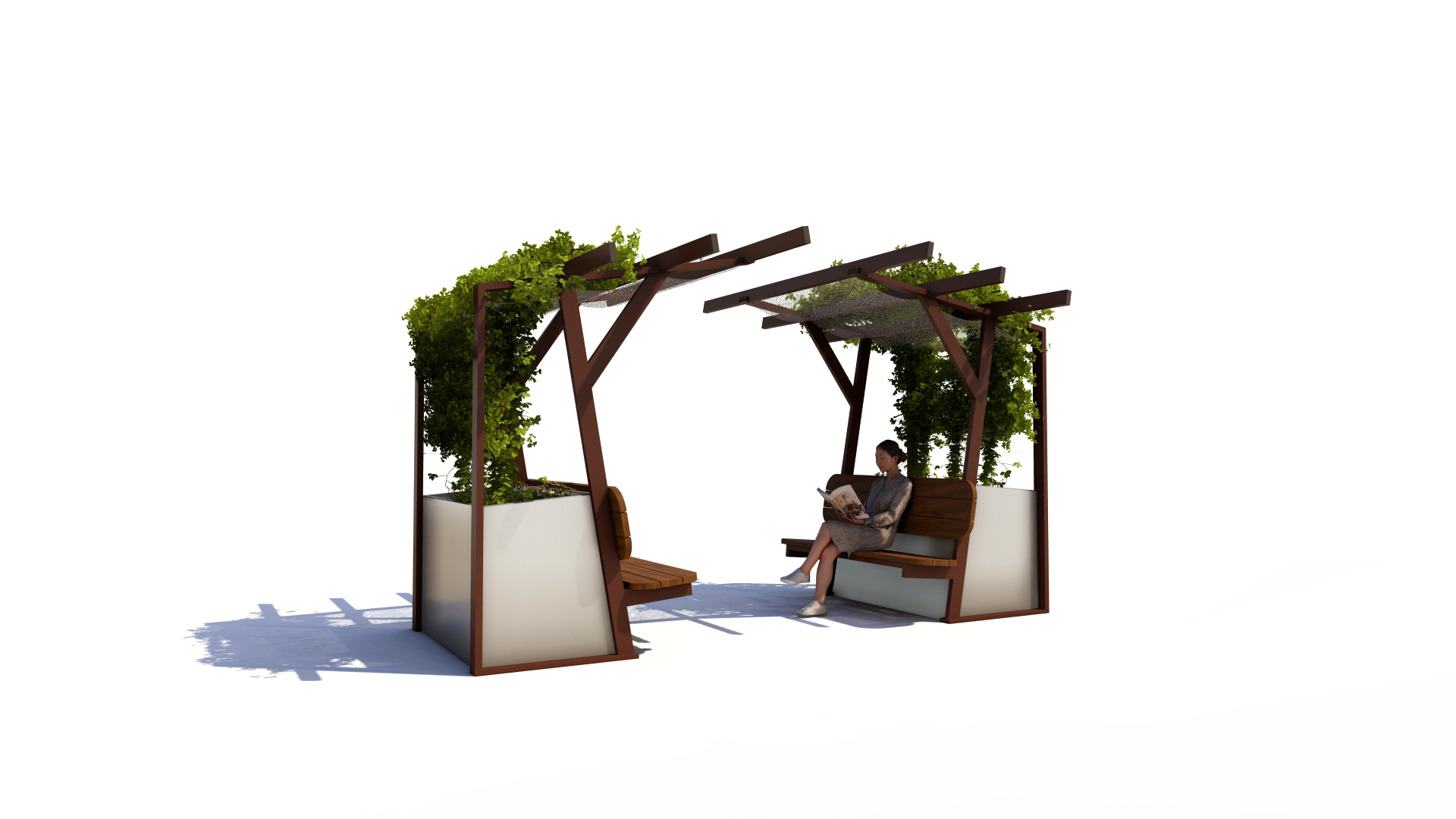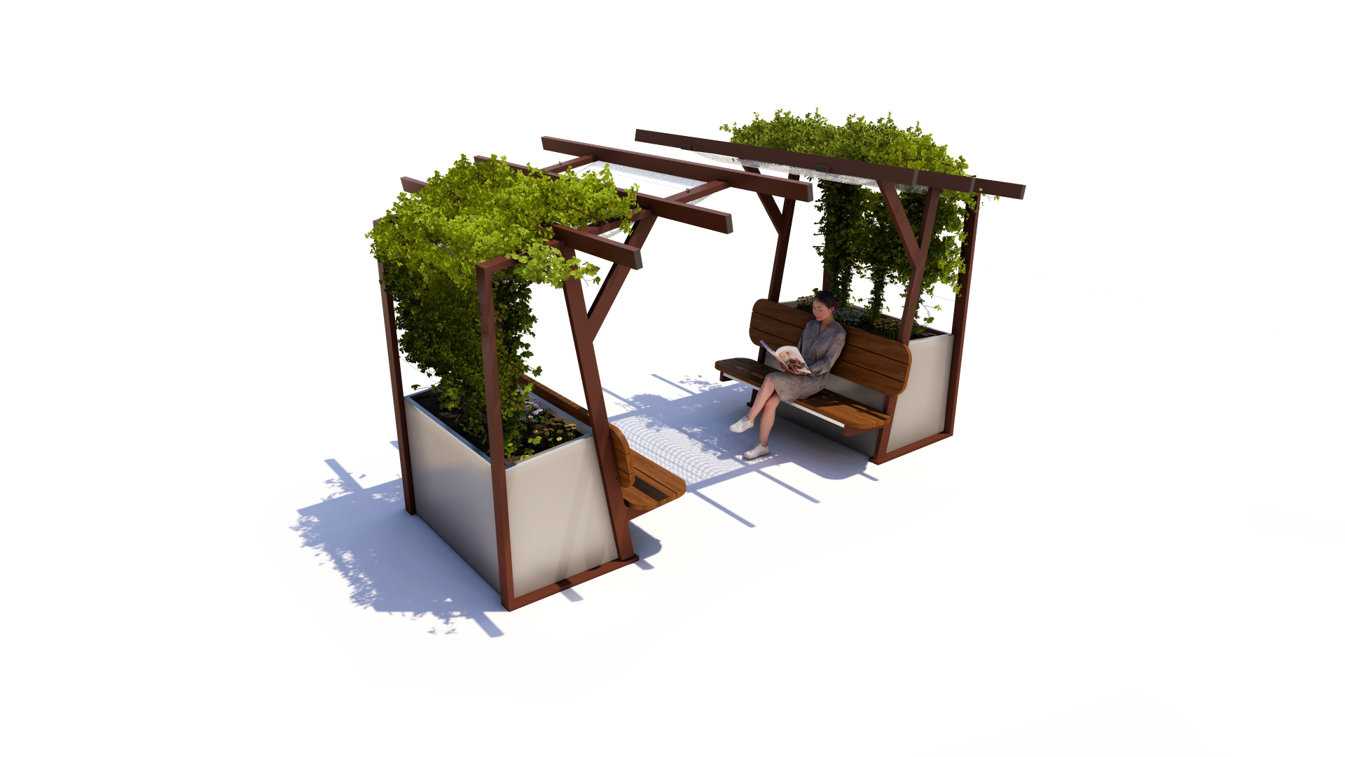 Pensé comme un lieu de pause et de convivialité, le banc Fotos 3 personnes évolue en un véritable îlot de verdure. Il prend la forme d’une large arche végétalisée, capable d’accueillir jusqu’à 6 personnes dans un espace enveloppant et vivant. Au-dessus, la charpente ajourée accompagne le développement des plantes grimpantes, créant un ombrage naturel qui évolue au fil des saisons.