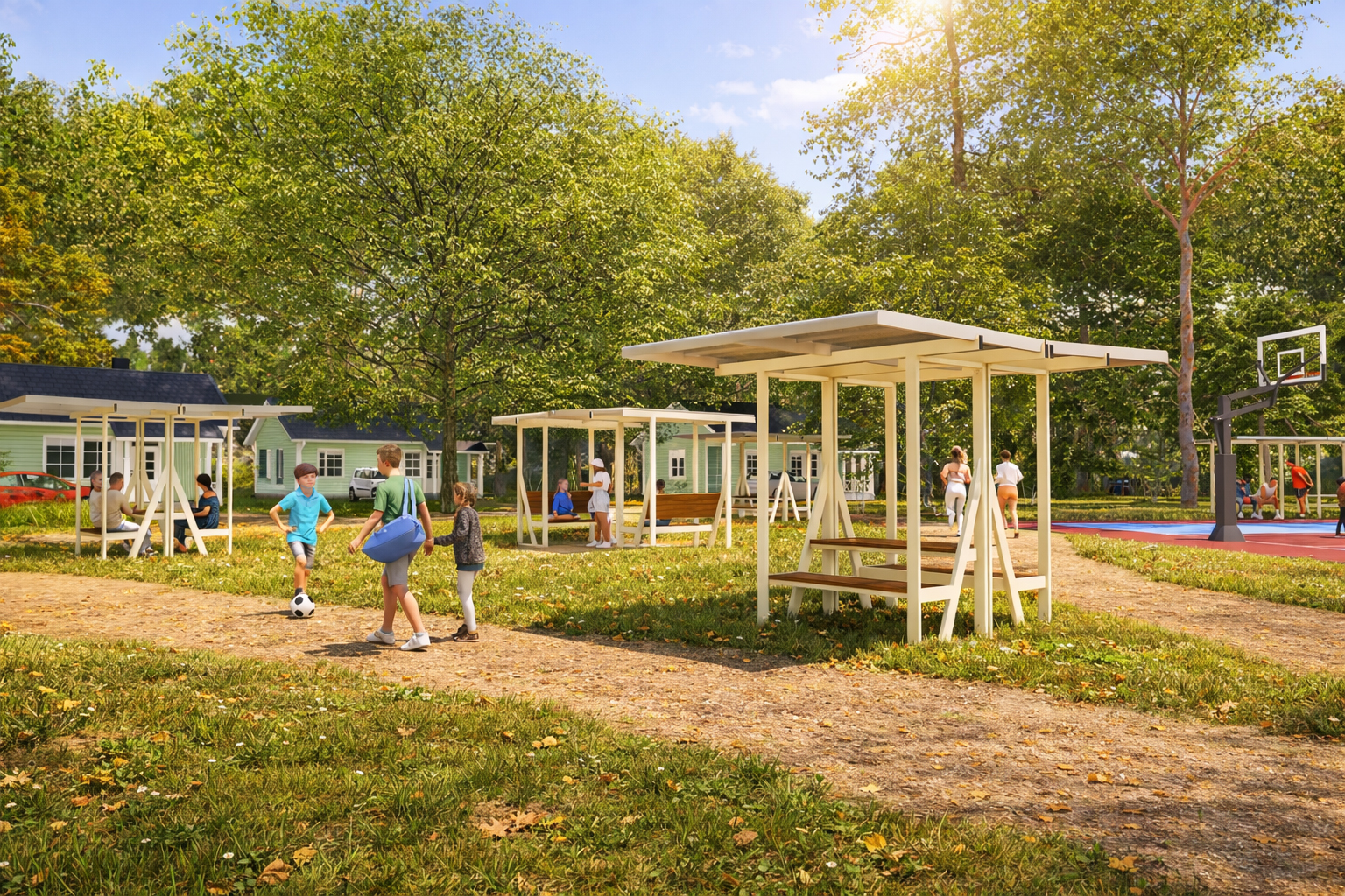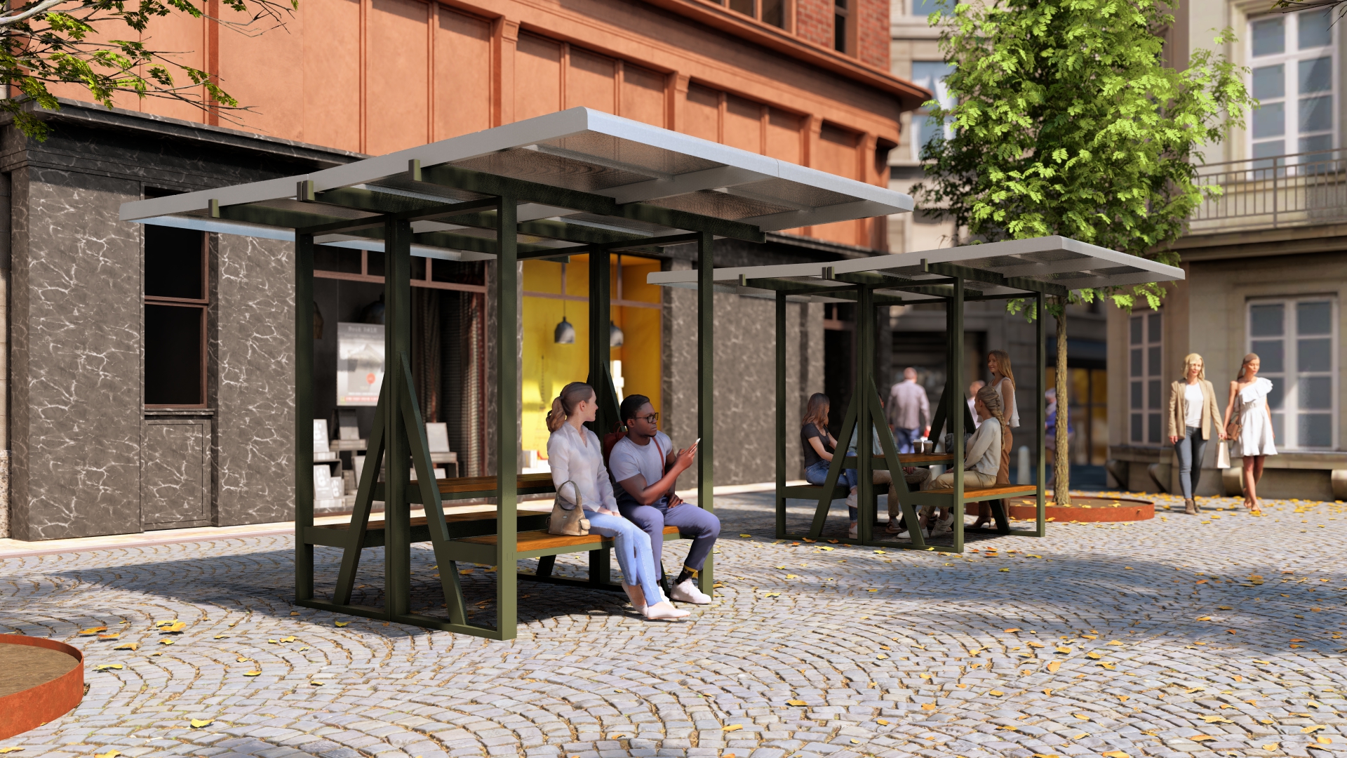 La structure, réalisée en tubes rectangulaires d’aluminium, encadre l’espace et crée une véritable alcôve en zone piétonne : un petit univers ouvert, propice à l’attente, à l’échange ou au repos. Au-dessus, deux larges toitures de 6 m² en tôle d’aluminium perforée diffuse une ombre généreuse et durable. Elle protège efficacement des rayons du soleil estival pendant les heures les plus chaudes de la journée.