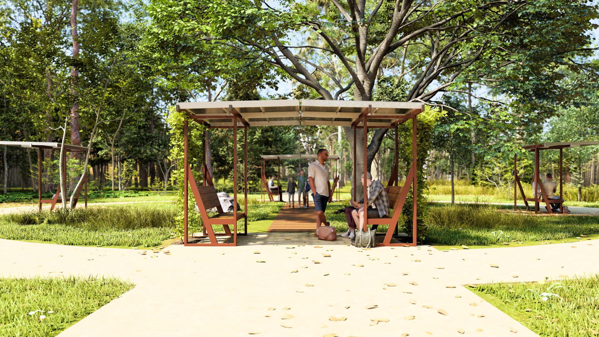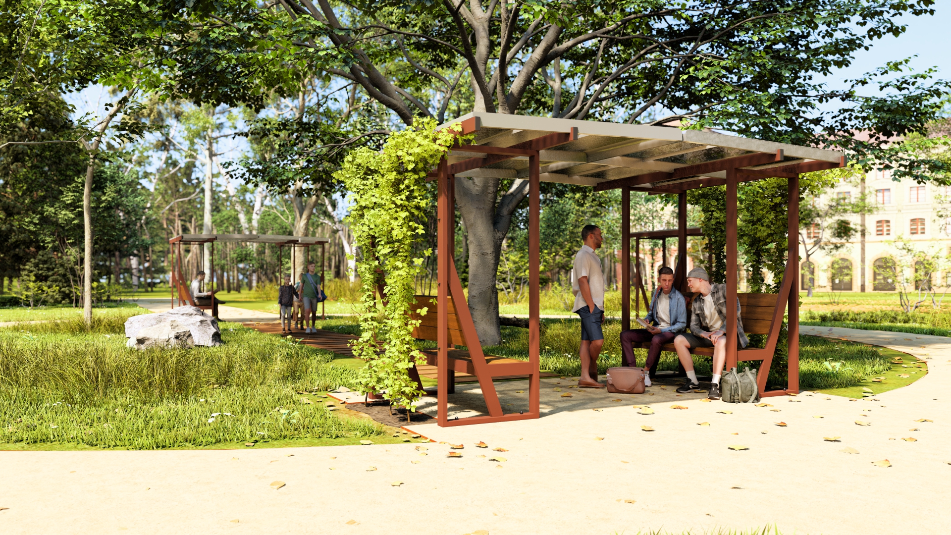 La structure, réalisée en tubes rectangulaires d’aluminium, encadre l’espace et crée une véritable alcôve en zone piétonne : un petit univers ouvert, propice à l’attente, à l’échange ou au repos. Au-dessus, deux larges toitures de 6 m² en tôle d’aluminium perforée diffuse une ombre généreuse et durable. Elle protège efficacement des rayons du soleil estival pendant les heures les plus chaudes de la journée.